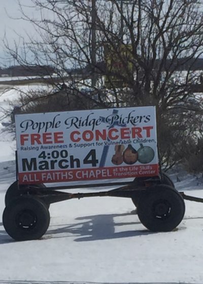 So here is an advertisement for an advertisement. There are two Popple Ridge Pickers signs out and about in the country side. The concert will be as you can see, on March 4th at 4pm. We scheduled this concert of blue grass and praise songs back in January and the weather made us cancel. Come and join us on March the 4th for an fun time in support of Project 24, the chosen project of the worshippers at the All Faith’s Chapel Sunday services.