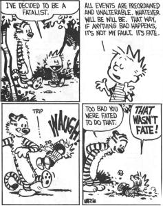 Fatalism seems to be a big part of Islamic theology. “Inshallah”, which means “if God wills”, is uttered by everyone of that faith at every turn or event in life. There is also a Bedouin saying that we should “trust in Allah” but tie up our camels”. The idea of fatalism is something that crops up all the time – “what will be will be”. We hear it in hospitals before surgery’s and in many places where major decisions need to be made or maybe not made. It is once again the consequence of the belief that God is both all-knowing and all powerful, and that therefore all that happens, happens by necessity. At the same time we want desperately to hang onto the idea of free choice.