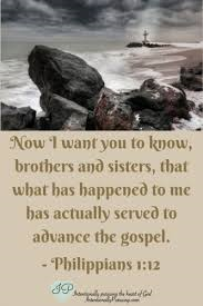 Here would be a fulsome translation of what Paul says – “I want you to understand and be personally apprised and cognizant so that you are thoroughly connected with me in knowledge brothers, that all the stuff that happened to me because I am in prison; all the people that I have met and how my friends have responded; has worked like an corp of engineers that goes before a might army to clear the brush and cut down the obstacles so that the army can do what it is meant to do, and that is to remove the enemy and crush the foe and rescue the oppressed. It moves forward as the grand great news that it is and the obstruction and obfuscations of men and the devil cannot stand up against it.”