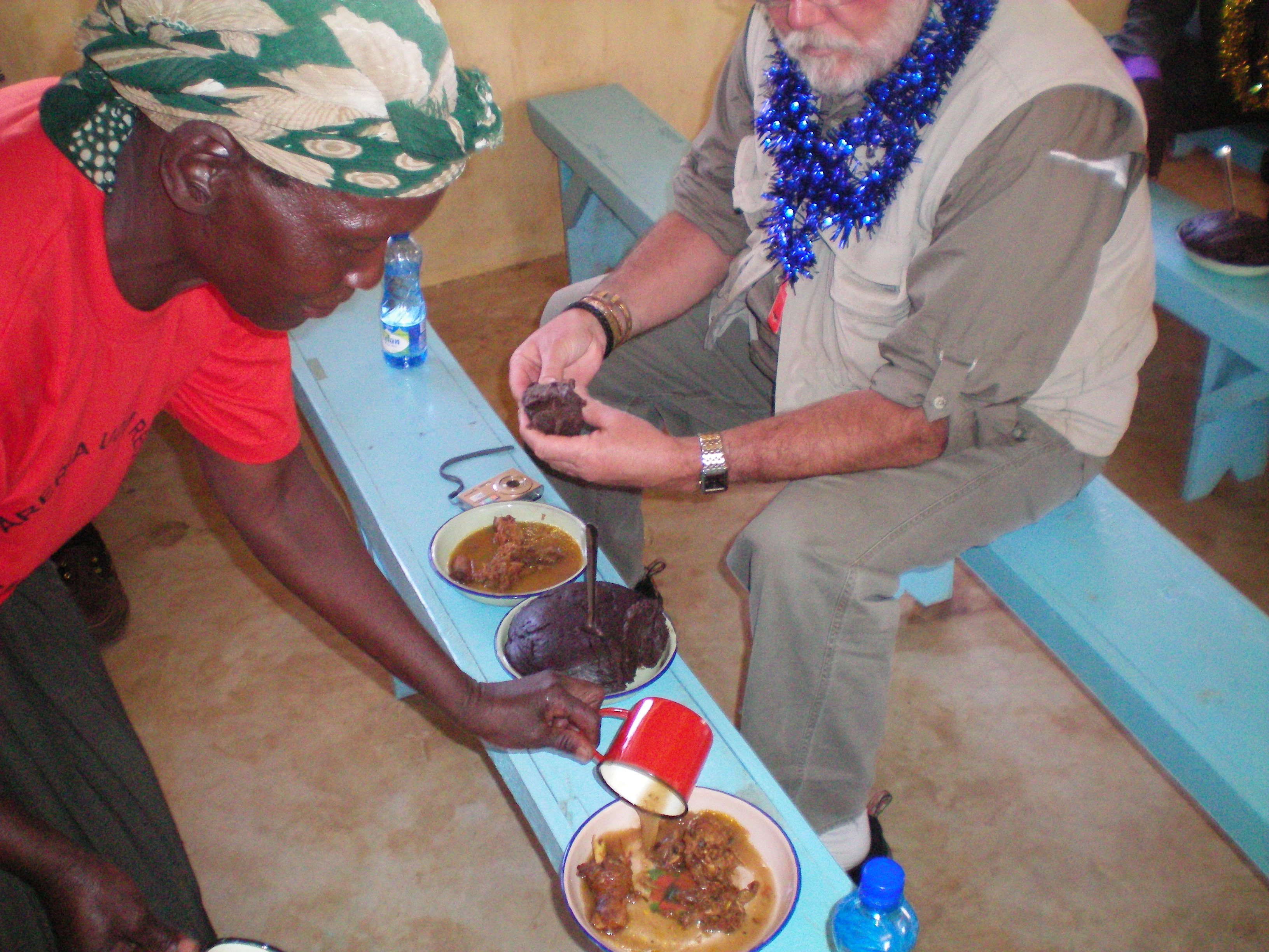 Before you enter the building in which you will eat, someone will be outside with a pitcher of warm water, a basin, a bar of soap, and a towel. You place your hands over the basin, and someone pours the water over your hands as you wash with soap, and then as you rinse. You are then handed a towel to dry your hands. After the meal (eating without fork or spoon) the same process takes place outside so that your hands are clean once again.