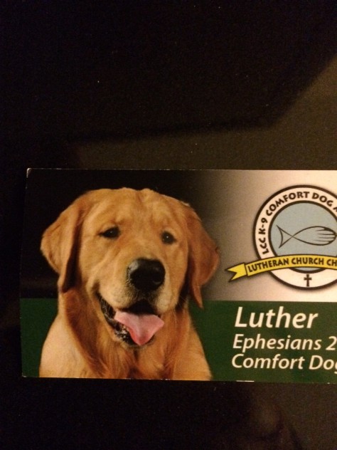 Luther the comfort dog has been on these pages before. I met him at the convention a few years ago along with his partners. He is a beautiful dog and when he looks at you it is as if he can read your mind. There is something about him that calms you immediately. I had forgotten tooth paste and had to get up early and run down to the lobby at the hotel where we were meeting to get so and so I was a little frustrated and there he stood. He had gone out for “walkies” and when he and his human came back they couldn’t get in the room. Luther took it all in stride and had a group of flight attendants absolutely enthralled. You can learn more about him and his friends at lutheranchurchcharities.org.