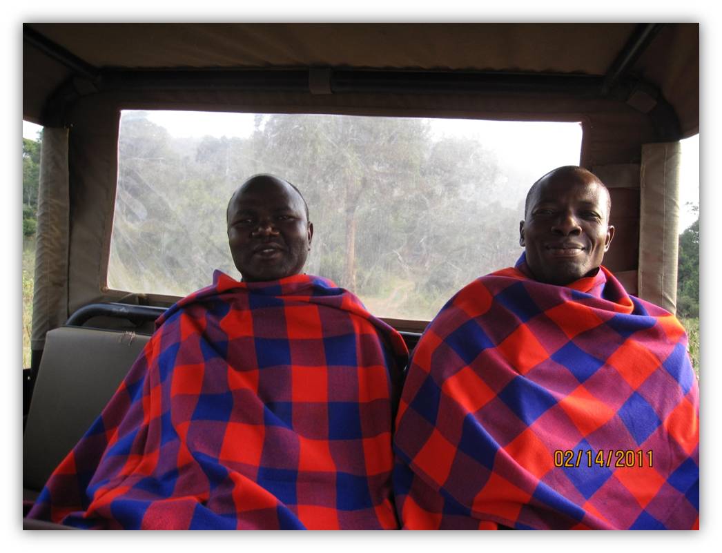 Hence the weird experience.  The February trip with the two District Presidents was, at least for me rather exhausting.  The last couple of days were to be spent in the Mara looking at animals and unwinding.  We got up before sunup to take a landrover out onto the plain and it was a chilly morning.  The driver offered me a cup of boiled milk and coffee and a blue and red checked blanket to keep the chill off.  Being a “macho” kind of guy I declined the blanket but ran for the front seat of the land rover because it is the most comfortable spot.  As I approached the landrover this is what I saw and I will go to my grave believing this is what I saw – two warriors in full blue and red checked robes.  They had the “eremet sero”, or leaf bladed long spear and the spears were painted white which meant they were prepared for war.  They each carried a rungo (club) and each of them had beaded head bands and looped copper ear rings.  They stared straight ahead and never acknowledged that I was getting into the vehicle.  Thinking that they were being transported to some remote village I settled into my seat a bit worried about the significance of a war lance but I settled in nonetheless.  One of the fellow travelers came along and said “did you see the Maasai guys in the back seat?” and I whispered back as fiercely as I could, “yes and be quiet about it”.  About a half and hour later while everyone was laughing they asked if I wanted to meet the Maasai guys.  Here is what I saw –