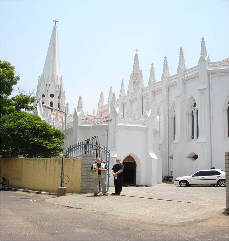 My friend Mr Ravi took this picture of John Fale and me at the Basilica of ST. Thomas in Chennai.  He is close to the ocean.  Here is a story from the Chennai Newspaper.  This is after the Tsunami of 2004…..
