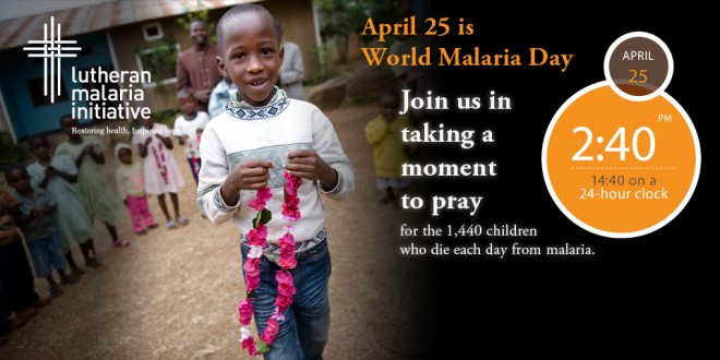 On Wednesday, April 25—World Malaria Day—please join us in a moment of prayer at 2:40 p.m. (14:40 on a 24-hour clock) as we consider the 1,440 Africans who die each day from malaria and remember in prayer all who suffer from malaria or will lose a child or other family member to the disease.