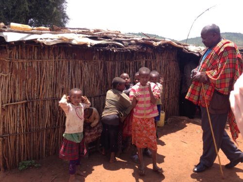 Bishop Kispan (of ELCK central diocese) with children escort us through a Maasai village nearby the Project 24 Lenkishon boarding facility.