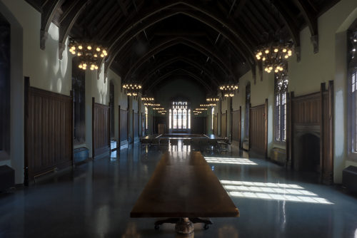 Named after a German castle that served as a haven to Martin Luther, Koburg Hall once functioned as one of the two original dining halls. The Collegiate Gothic style is exemplified in the high Tudor style arches of the vaulted ceiling and the large carved stone fireplace. Chandeliers and many original stained glass windows provide lighting.