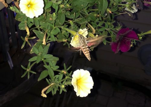 These are moths that fly like the hummingbirds and drink nectar from the flowers the same way. I haven’t had a chance to study up on them but I called them hummingbird moths and a quick glance at some sites confirmed that. They are also called “hawk moths”, and “sphinx moths”. I counted at least 7 of them around my patio chair and found them pretty fascinating. Evidently they are relatively common but many people don’t see them or realize they are around unless they hang on a screened door.