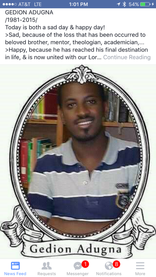 Gedion was a colleague of Dr. Al Collver the head of the Office of Church Relations and an important part of the seminary at Addis Ababa in Ethiopia. He was from Deberberhan. He was 34 years old. He was murdered in a robbery.