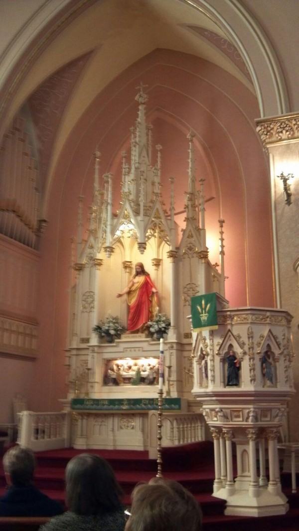 Someone sent me this picture of what we affectionately called “Old Trinity in St. Louis”. This is pretty much the grandmother church of the Missouri Synod. This ornate old sanctuary brings to light the words of Hermann Sasse below. Matt Harrison has been giving us great sections of writting by Hermann Sasse. One of them had to do with Gospel and Sacraments and the fact that churches that do not have the Sacraments are basically “societies”. Look at the frontispiece of the Altar, front and center is a model of the Lord’s Supper. To the side but slightly ahead is the pulpit and a painting of Luther preaching and some other figures of prophets I believe.