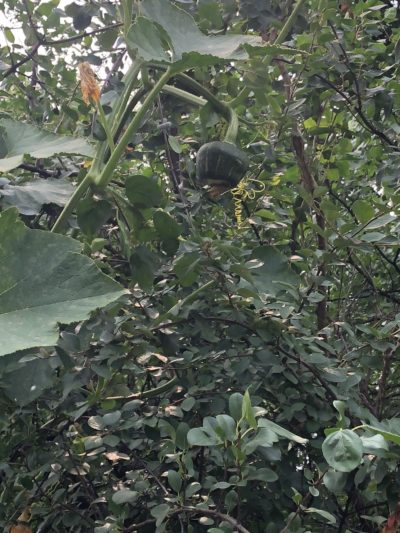 I planted an acorn squash tree a long time ago and it never had any fruit – finally – this year.