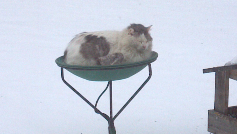 We have an old Tom cat that hangs around our place.  We can’t get near him but we feed him and he drinks the water out of the bird waterer that we have out back.  He sleeps in the bird feeder too.  He must have finished the water and figured that the warmth from the waterer was pretty nice.  Reminded me of Psalm 4.