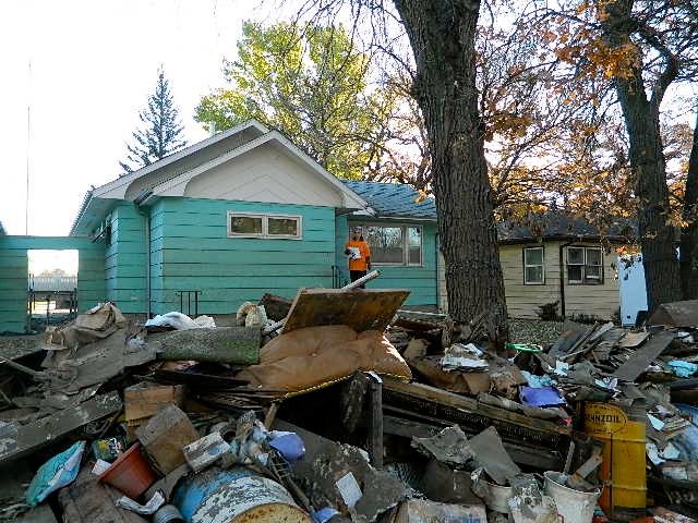 More pictures from Pastor Breitbarth. It looks like a good crew but the amount of devastation is really quite amazing. There is talk about doing a “Camp Restore” type of rallying point at Our Saviors Lutheran Church in Minot where people can come and work and stay and eat. Transportation has been provided by Dahlstrom Chevrolet of Oslo Minnesota. You can read about that in the September 18 and 19th blogs. We continue to ask for volunteers. This is a long process. As you can see from the pictures this is labor intensive.