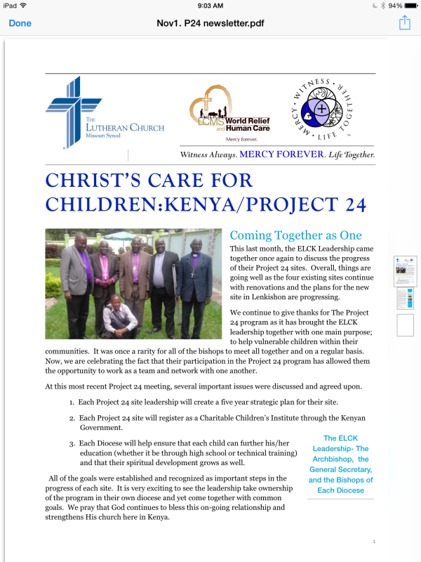 Christ’s Care for Children Kenya is the Student support piece. Project 24 is the building and construction piece. Project 24 donations can be sent to the North Dakota or Minnesota North District or Directly to the Lutheran Church Missouri Synod. Please do not google Christ Care for Children Kenya to make a donation but share this address and write this down – Gary.Thies@lcms.org or send him things via snail mail to 40718 Hwy E16, Mapleton, Iowa 51034