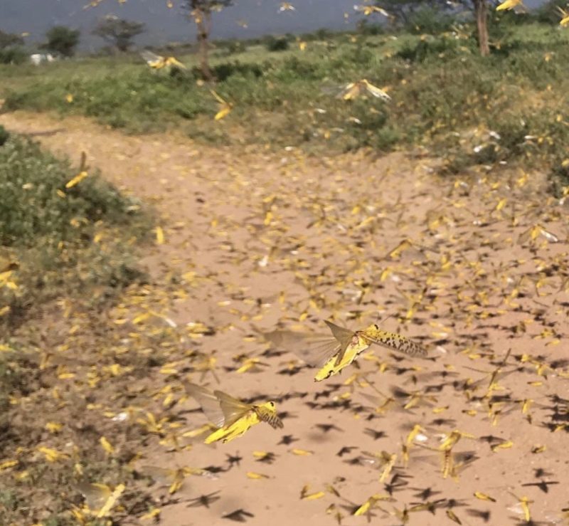 The picture was taken by my friend Kissinger, the project manager for Project 24 in Kenya.  He was visitng a project 24 site in Wamba where I visited many years ago.  We were a team of six who went there, and had the great chance to milk some camels.  It is a beautiful remote spot and it was a great trip featuring pushing our van out of sand traps about every three or four miles.  I have been hearing about the locust infestations in East Africa but I never heard where they were.  Now I get the pictures and remember the spot.  The road kind of ends at Wamba and the hills come alive in the evening with the elephant herds that meander through the trees browsing.  The camels come into camp to be milked and the low rumble they make sounds sometimes like distaint thunder.  We stayed in a place that looked like an old hunting lodge.  It was a part of the Earthwatch Center for Drylands Research.  Staying there I felt like I was living in an H. Ryder Haggard novel.  It is a beautiful place and now they have locusts.  I remembered those remarkable words from Joel where God promises to restore not what the locusts ate, but the years the locust ate.  Fascinating use of words.