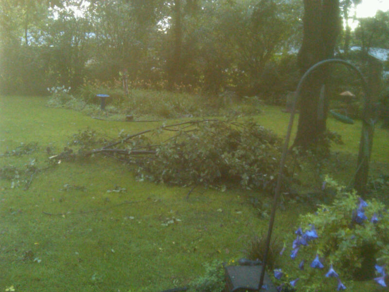 Tremendous thunder storm ripped through here last night. I use the descriptor because at one point it sounded like the sky was literally “ripping” apart. When I got up this morning I saw the source of the ripping sound….a large part of my tree was down and there was more in the front yard. There was quite a light show.