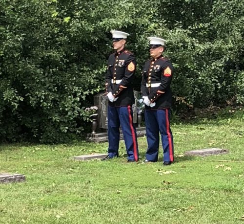We went by funeral procession from the church to cemetery which was about 7 miles away. Walking across the grave yard the Marine guard was standing in the corner of the shelter belt waiting. How long they had been there I do not know. They get their orders out of Quantico. Military Funeral Honors is the ceremonial paying of respect and the final demonstration of the country’s gratitude to those who, in times of war and peace, have faithfully defended our nation. The Military Funeral Honors ceremony consists of, at a minimum, the folding and presentation of the American flag and the sounding of Taps by a detail of two uniformed members, in addition to a bugler, if available, of the Armed Forces.