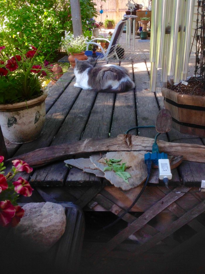 I know this has been driving many of you crazy. The burning question has been where are the cats and how many are there. I told you there were 5 and folks havent been able to find them – so – there is one old feral at peering our from the slats at the bottom of the picture – 1. One on the deck – 2. You can see the body of a black cat behind the blue chair and off in the distaince under the blue orb is another – 3 and 4. The one that no one picked up one is right in fron of the cat on the deck. It is a cat planter and that is 5.