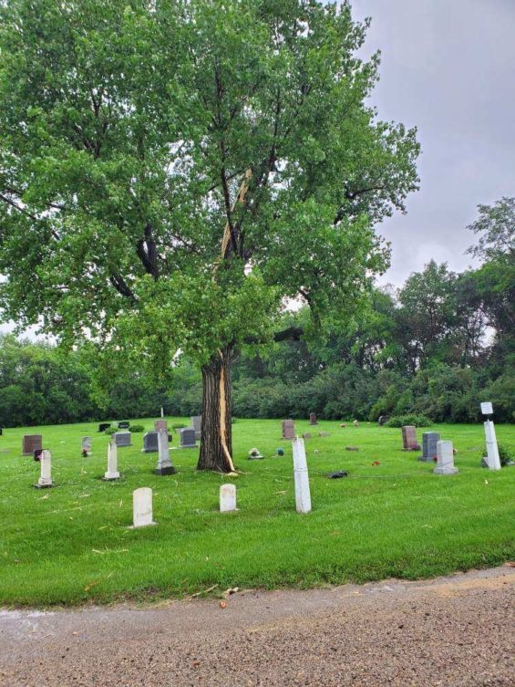 Just got this picture of what I would call an iconic tree on our old cemetery lot that was struck by lightning and split from the top to the bottom. I don’t know how long the tree has been there but it was big when I came here 40 some years ago. It sits like a sentinel on the prairie as if giving shelter and shade to this dormitory of the faithful departed. It’s a contemplative place at sun set and quite lovely in the mornings. It gave shade and a cool breeze to those who came to visit the final resting place of their loved ones, and it is a wonderful resting place for the birds. Hopefully we can do something to fix this so this old tree can stand Sentinel for years to come .