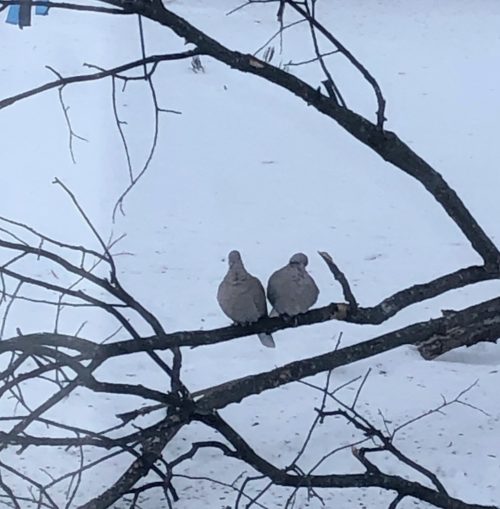 Picture quality is not the greatest but ……….. Everything I read says that they should not be here at all. They look like mourning doves but they are bigger and they have a collar on the back of their neck. I thought they were ring necked doves when I first saw them but the ring neck are native to Africa and then I found the Eurasian Collared dove and I think that is what they are. They may have been pets that someone released but however they got here, they shouldn’t be here and they seem pretty happy and content to eat my food and drink my water. They shouldn’t be here but they fit right in and are fun to watch especially when they maneuver to get to the water. They must be a nesting pair and so I am waiting to see if they stick around and we get to see a brood of little ones this spring.