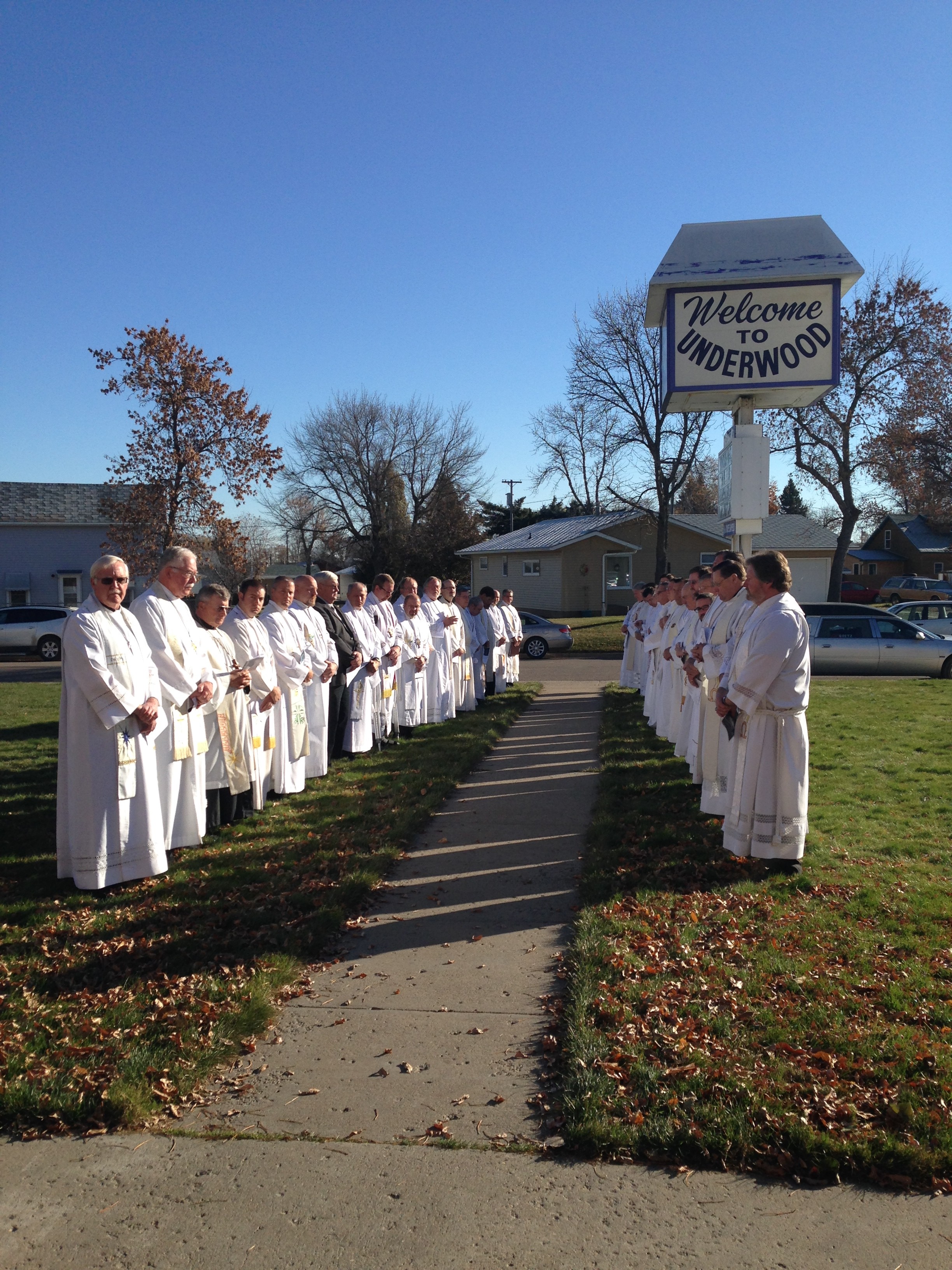Most of the Pastors in the North Dakota District and one from Minnesota North gathered under the welcome to Underwood sign to serve as a sort of honor guard for Rev. Dean Hartley. The service was officiated by North Dakota District President Baneck and some of the Pastor also formed a choir that sang “Abide with Me”. Members from all of Deans churches attended the service at the Underwood School. Pastor Baneck told the gathered crowd that Dean wanted them to see Jesus. That is a tribute that all Pastors should strive for – let you people see Jesus.